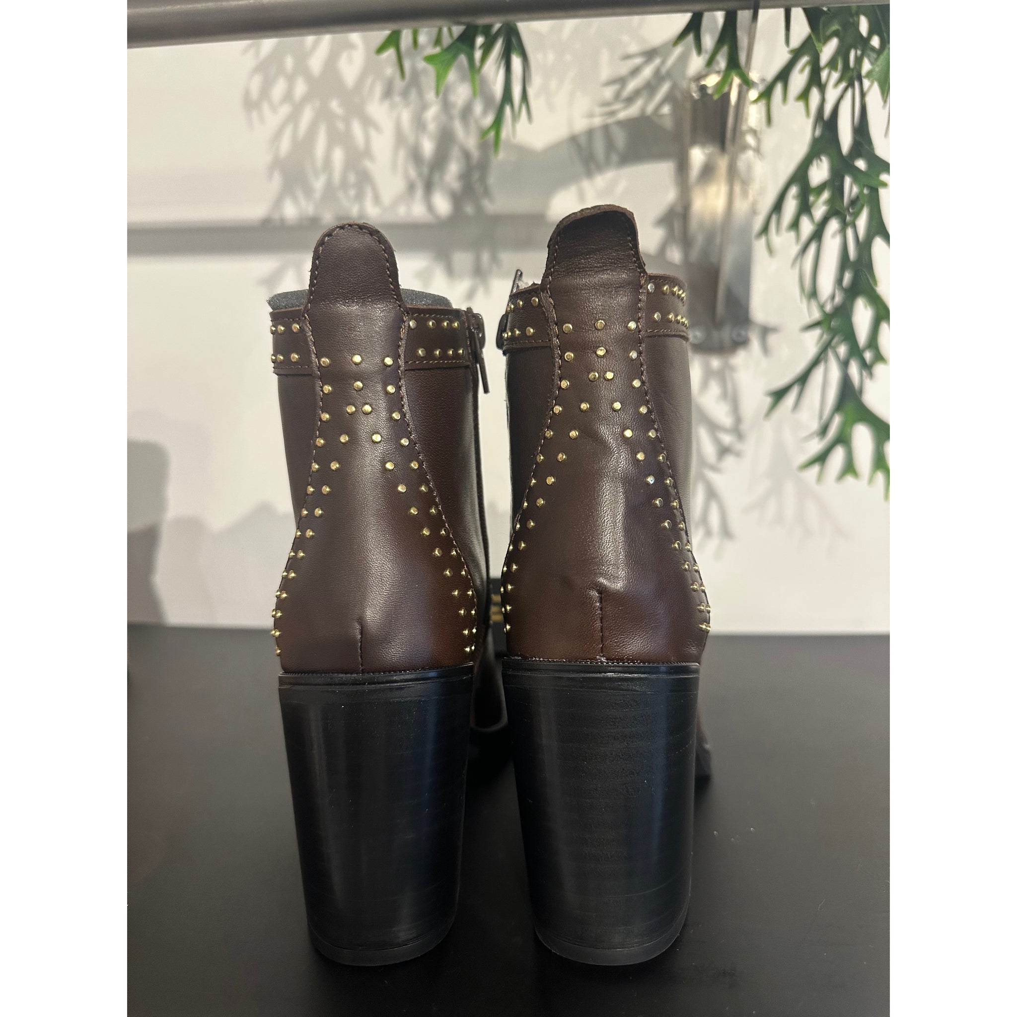 Crafted in a rich brown nappa leather, this boot is detailed with gold studding across the upper for a chic yet modern finish, a nice detail against the brown. The block heel provides the perfect balance of height, support and comfort, making them ideal for all-day wear. They also have a fine platform sole at the front, which gives that extra comfort to the ball of the foot.
