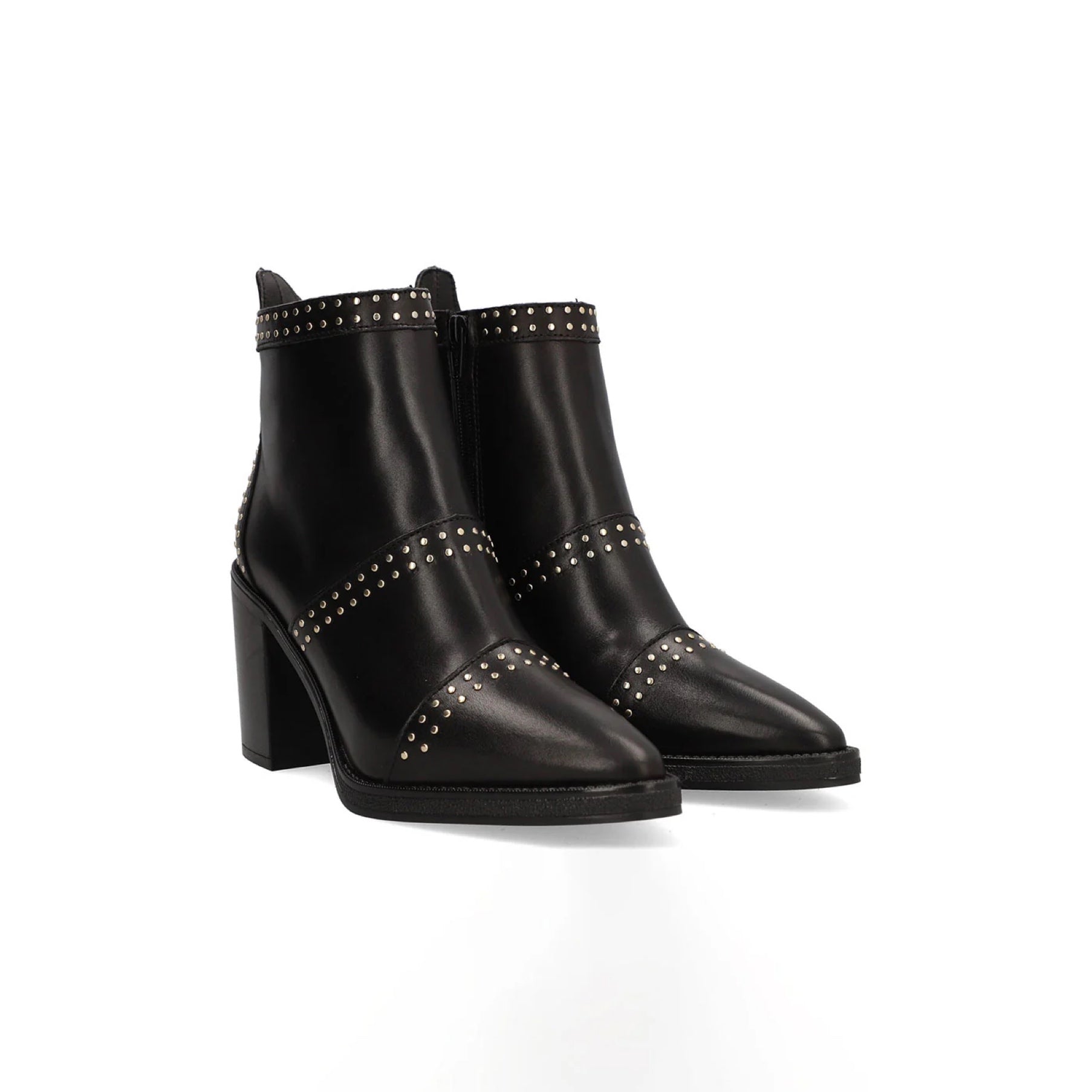 ALPE women's ankle boot in black, ideal for urban looks with a sophisticated touch. Crafted from high-quality nappa leather for durability and style. Elegant design with decorative metal studs on the instep, heel, and upper. A wide 7cm heel provides height and stability while walking. Non-slip rubber sole improves traction and security with every step. A pointed toe flatters the silhouette and adds a modern touch. Side zip closure for a comfortable and quick fit. A padded foam insole provides all-day comfort.