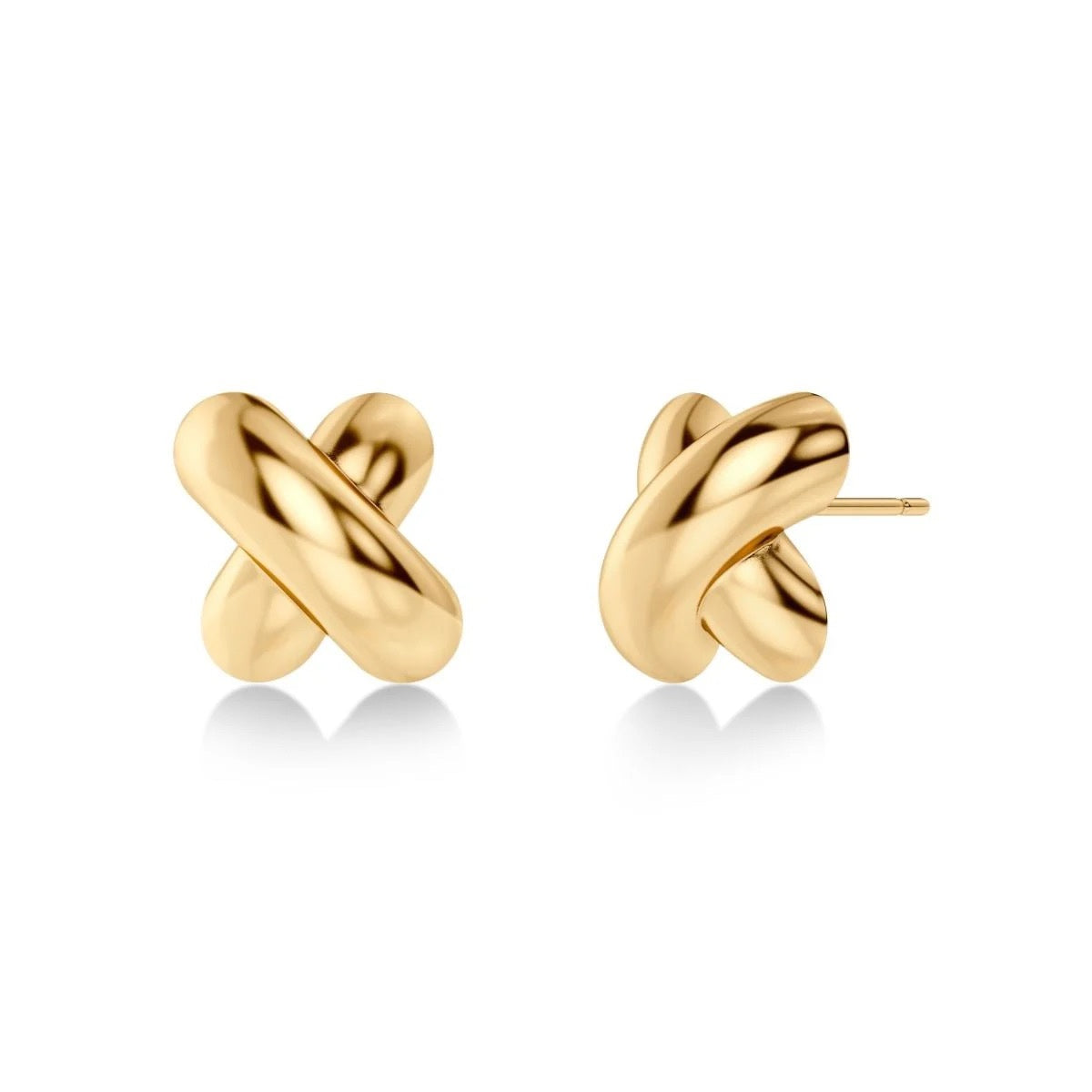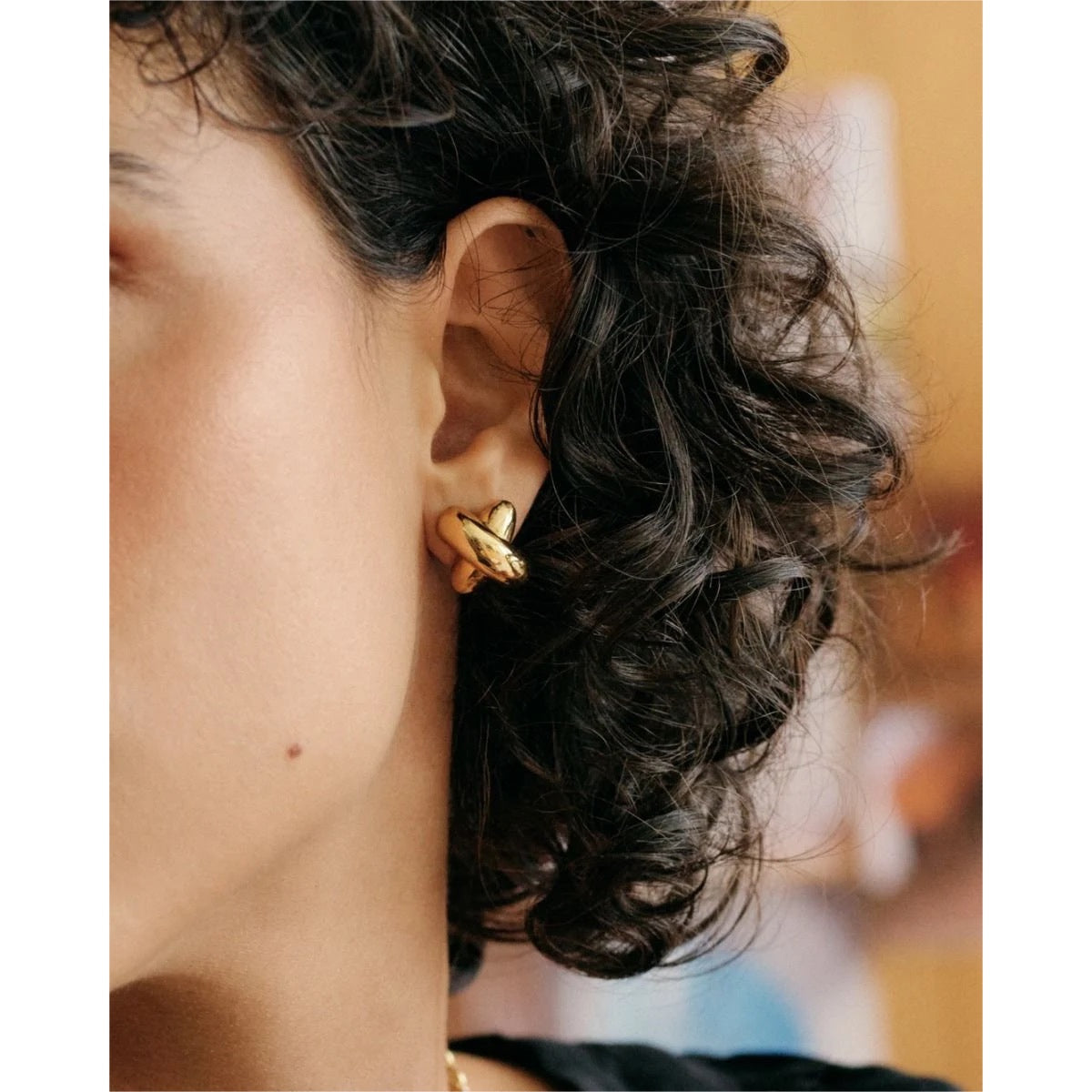 Alexa is a striking line with a clean and elegantly sculptured design. The pieces stand out beautifully, but are perfect for layering and stacking, whether worn casually or on special occasions. Seen here in large studs in 14K gold plating, with large back parts that ensure they sit elegantly on the ear. Goes brilliantly with the bracelets, necklaces, or rings from the same line.
