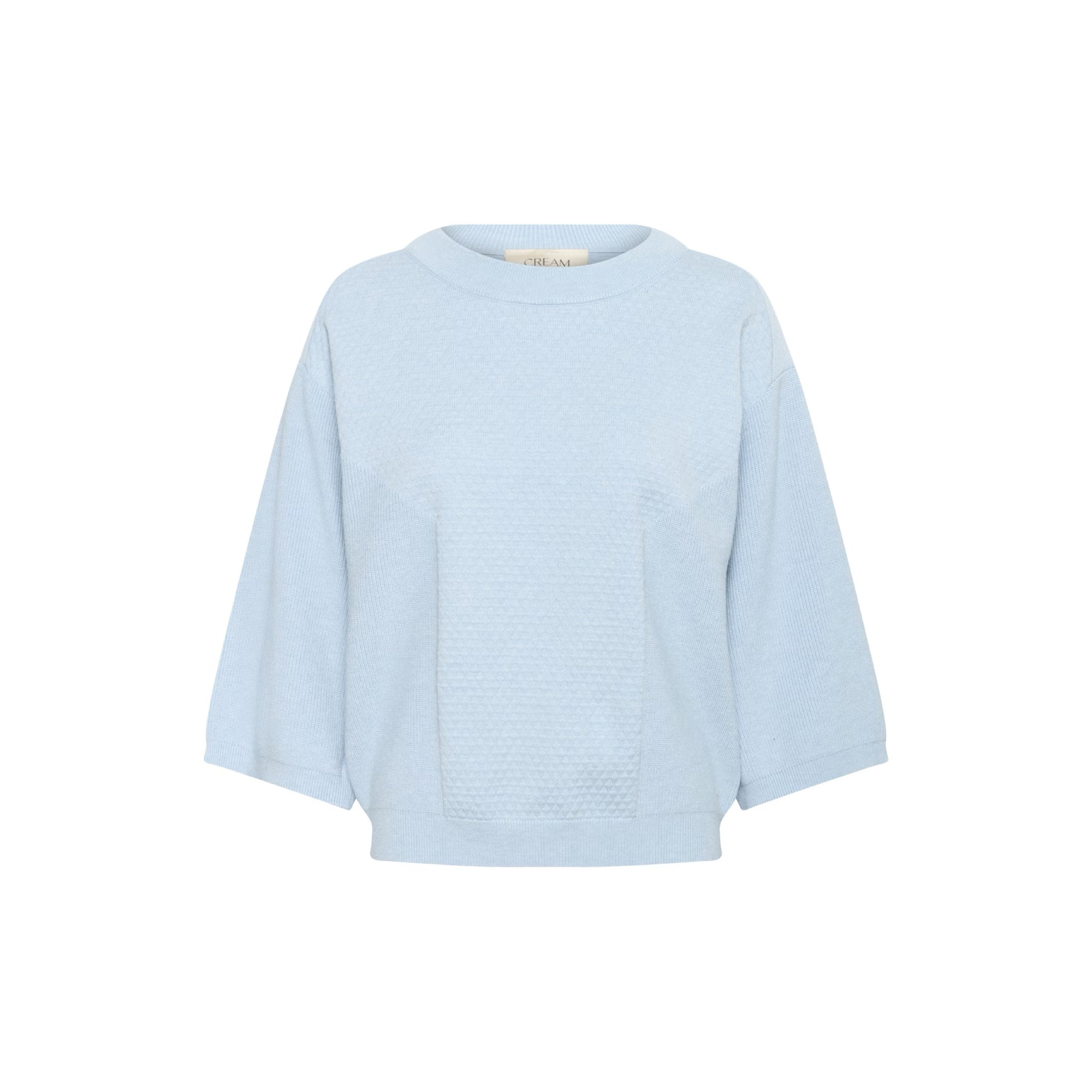 This women's pullover sweater features a relaxed fit, wide three-quarter sleeves, and a structured boat neckline. Soft fabric and unique texture make it suitable for both casual wear and professional settings. Ideal for layering.