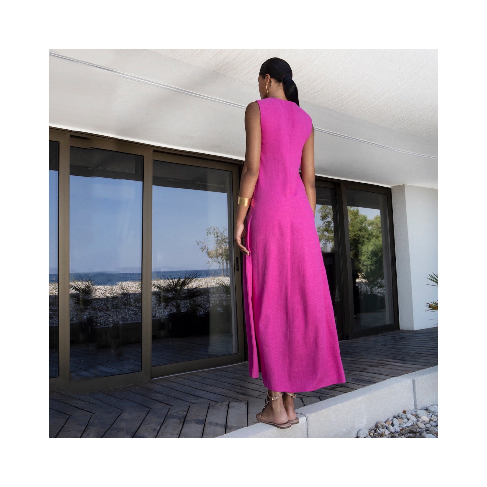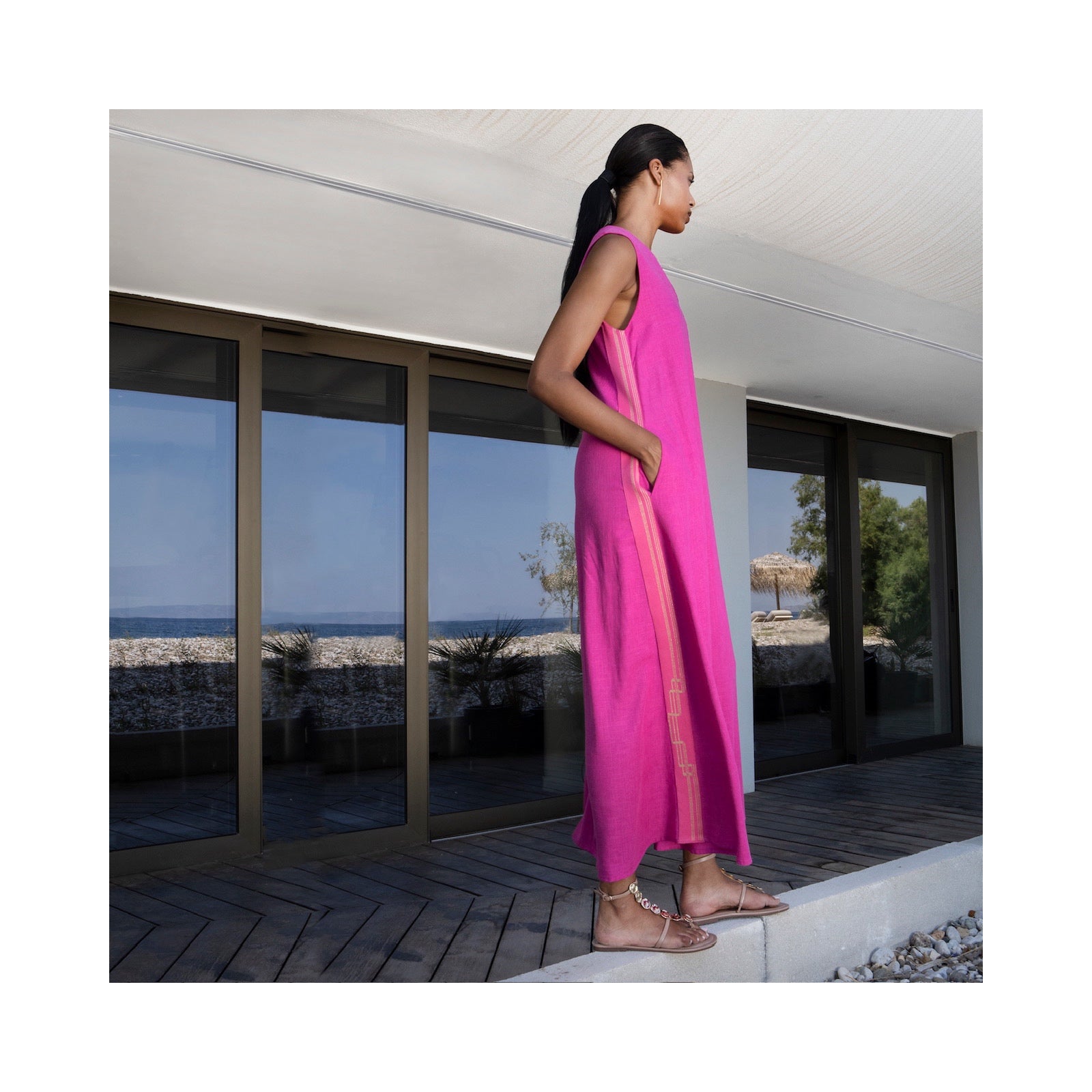 Aggel solid colour sleeveless a line maxi dress with contsrats lurex knitted gold and pink panel, under arm to hem. V neck and button fastening at back.