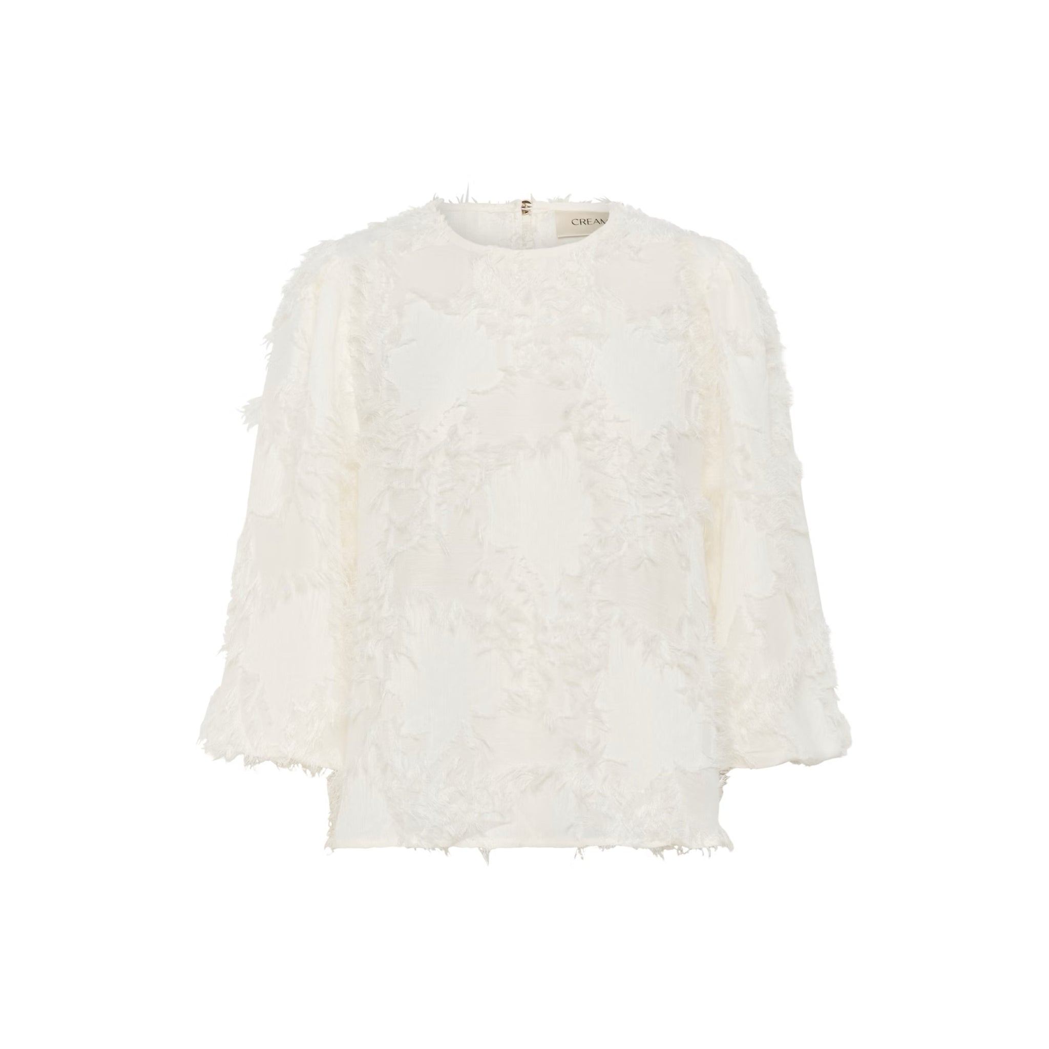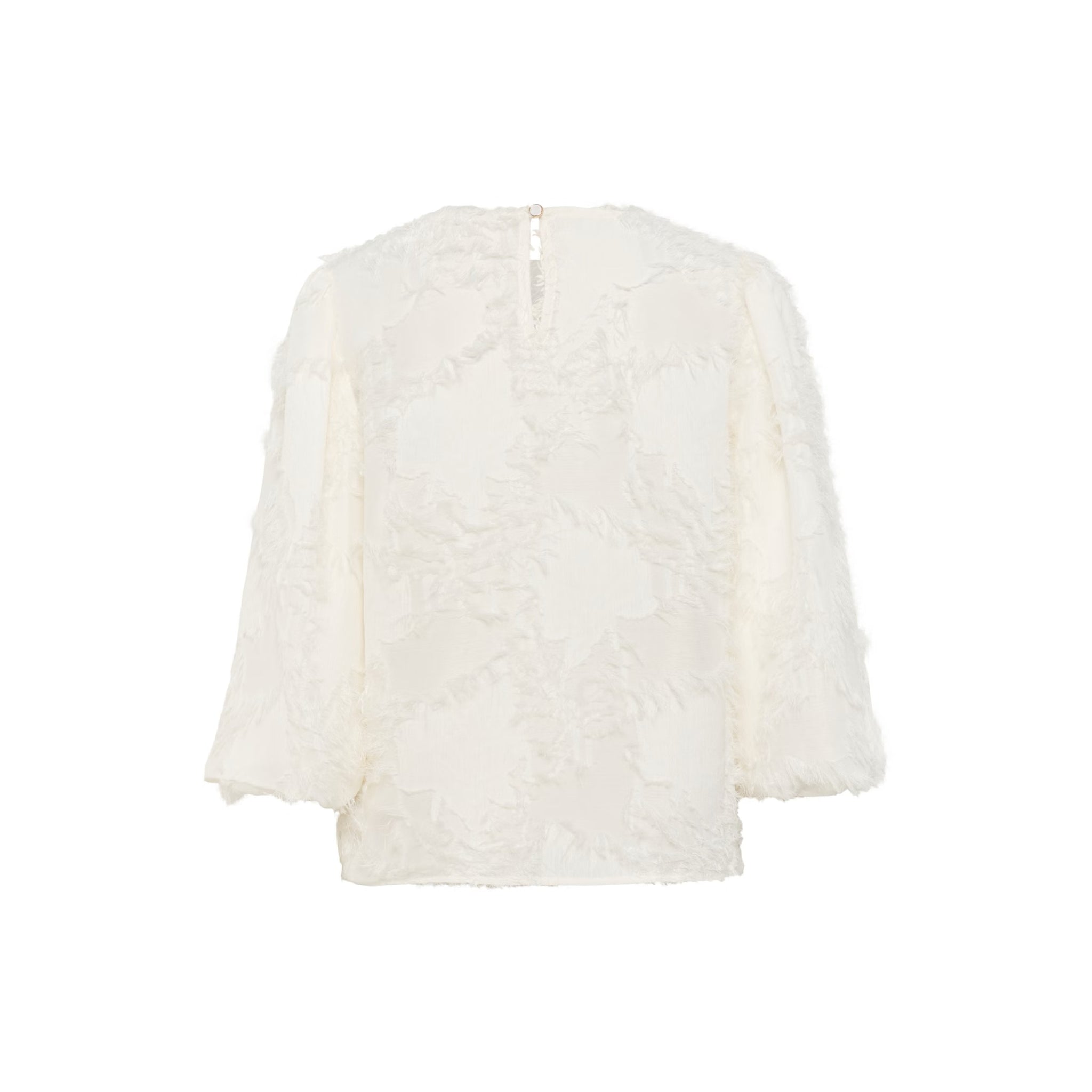 Textured blouse with a soft, lightweight finish, relaxed silhouette, round neckline, and three-quarter wide sleeves. Statement frayed detailing defines the unique surface for a modern and tactile touch.
