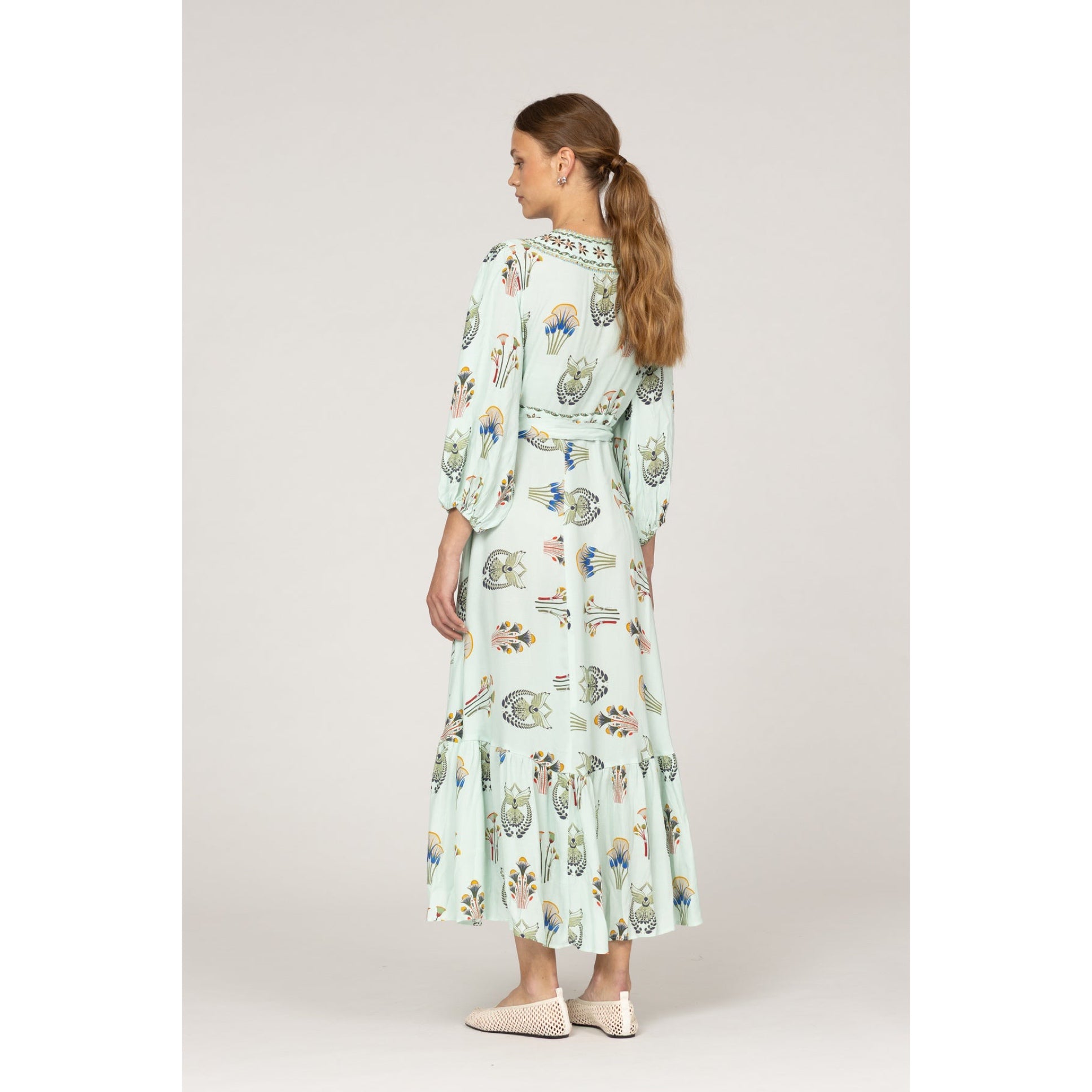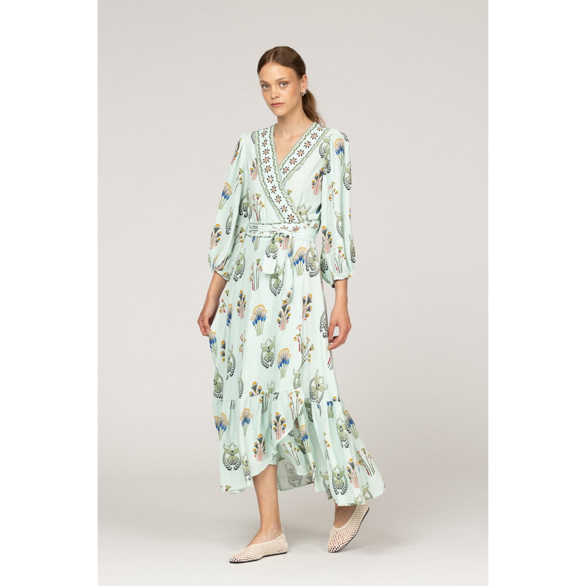 Embrace effortless elegance with this Inoa Daisy wrap maxi dress, featuring a flattering V-neckline and flowing silhouette in soft light blue silk. The summery print adds a playful touch, while the tie-waist design creates a graceful, adjustable fit. Perfect for warm-weather occasions, this wrap-style dress combines comfort with timeless style for an understated, sophisticated look.