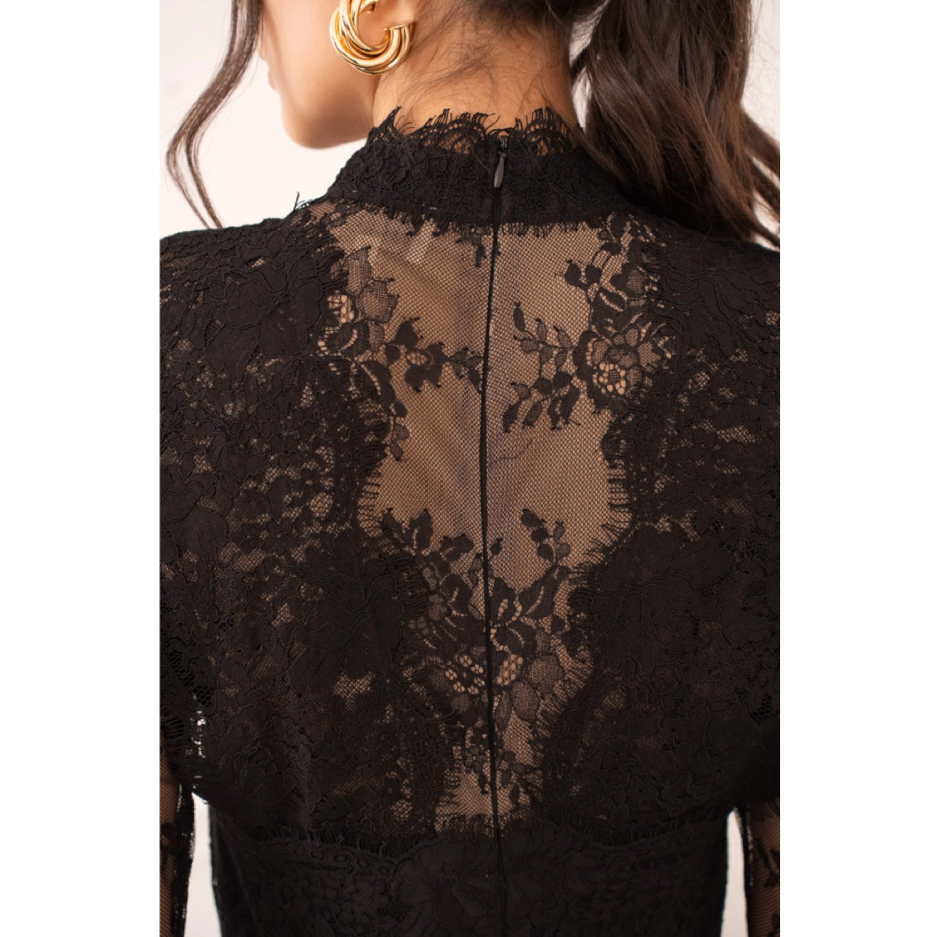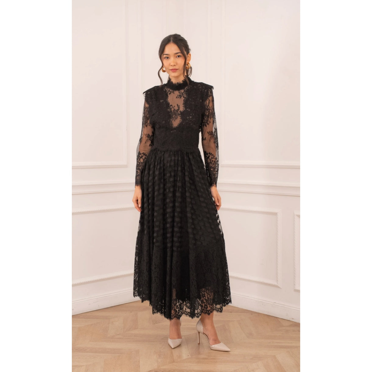 Elegant and timeless, this long black lace dress embodies absolute refinement.