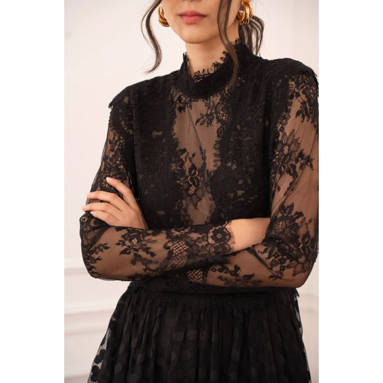 Its fitted top, enhanced by delicate floral lace and a high collar, subtly reveals the skin through a mastered play of transparency.