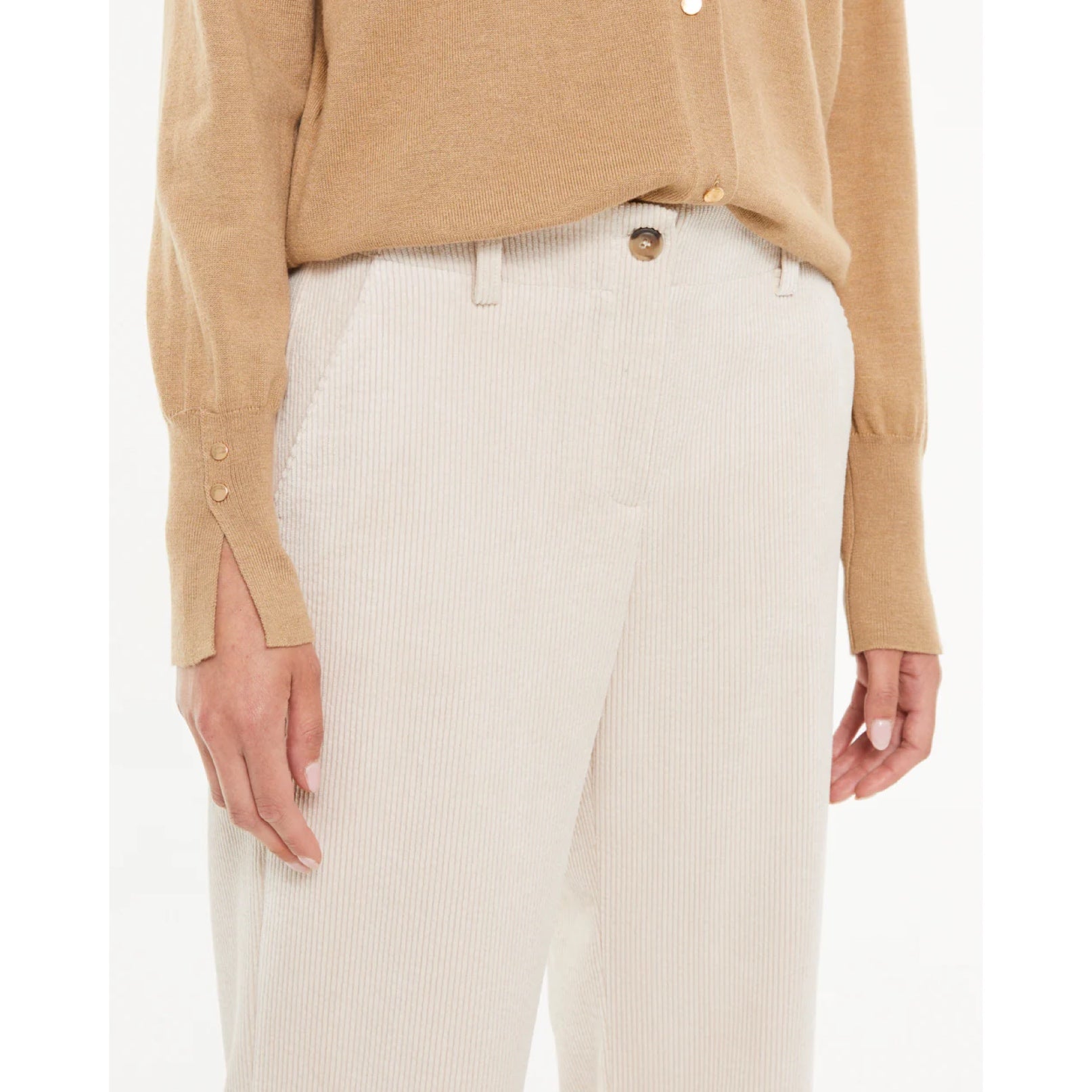 Straight-leg corduroy trousers with side pockets and welt pockets at the back. Button and zip closure with belt loops.