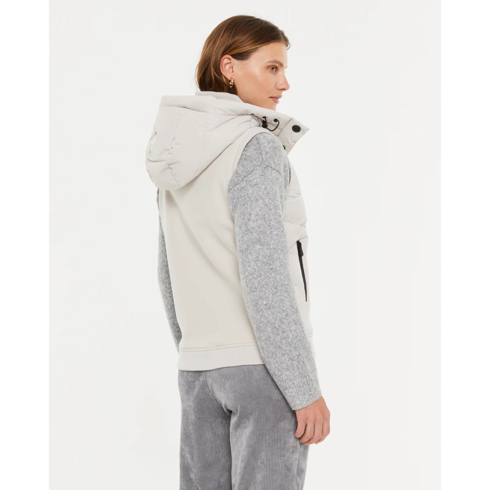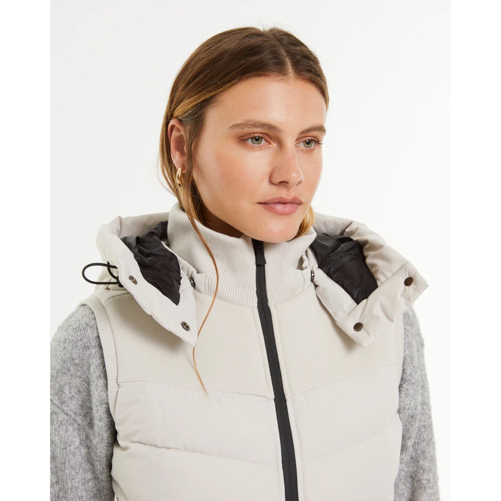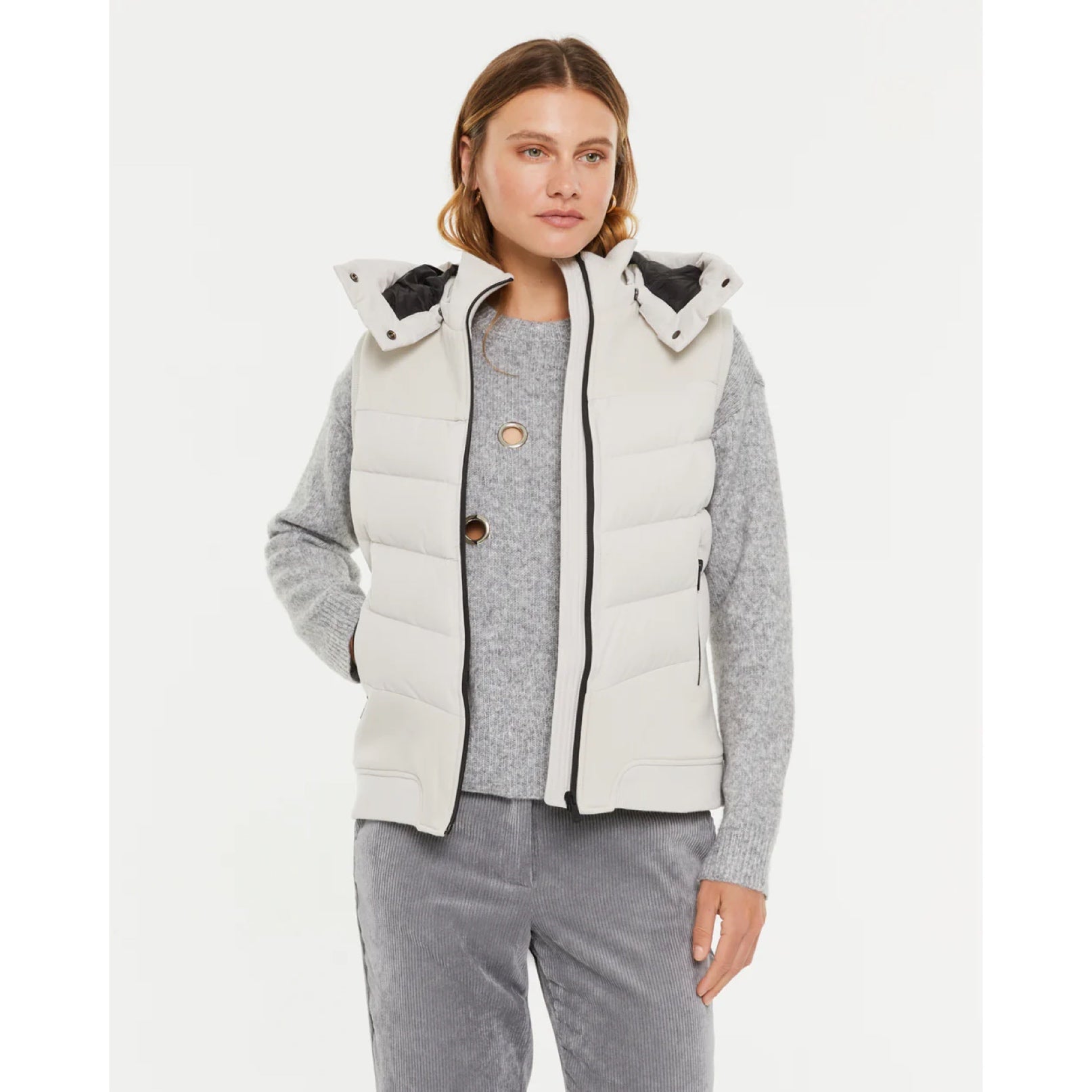 Short quilted vest with a high knit collar, detachable hood, snap fasteners, and contrasting zippered pockets. Made with technical fabric on the front and a knit back. Front zip closure. Regular fit.