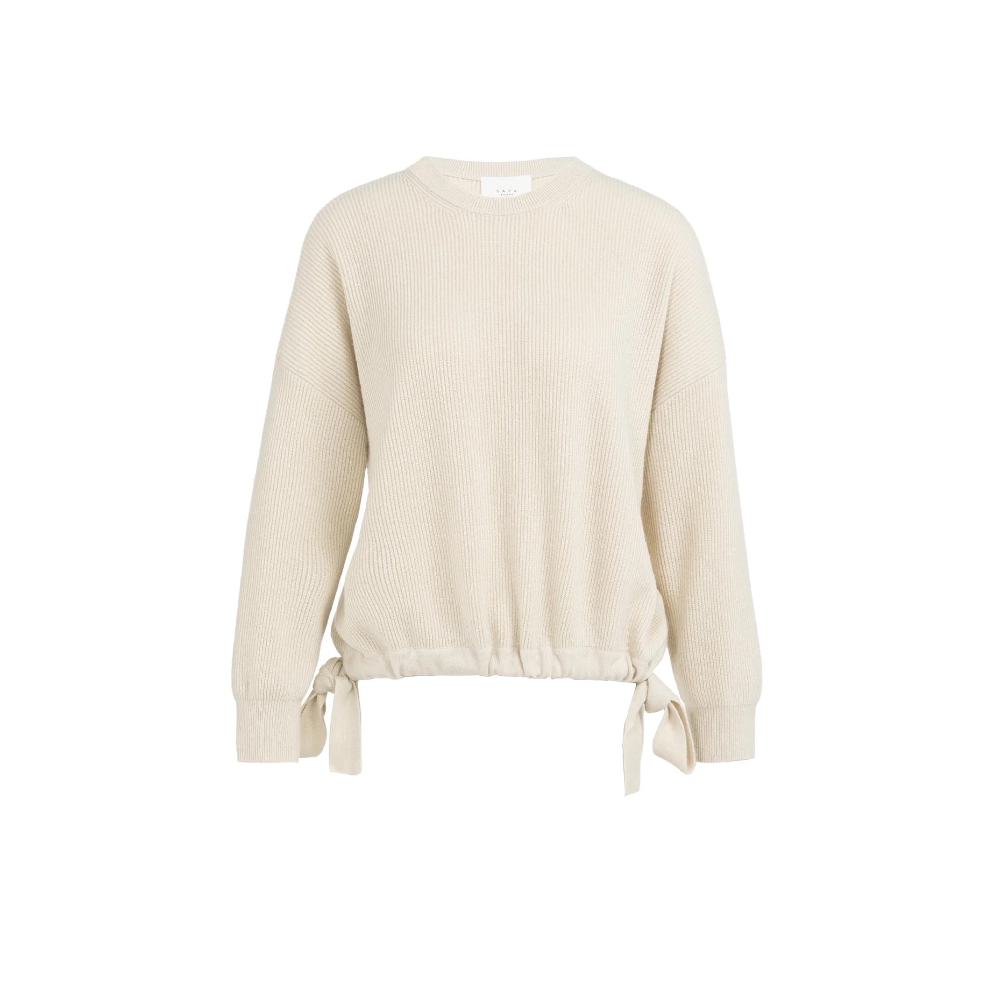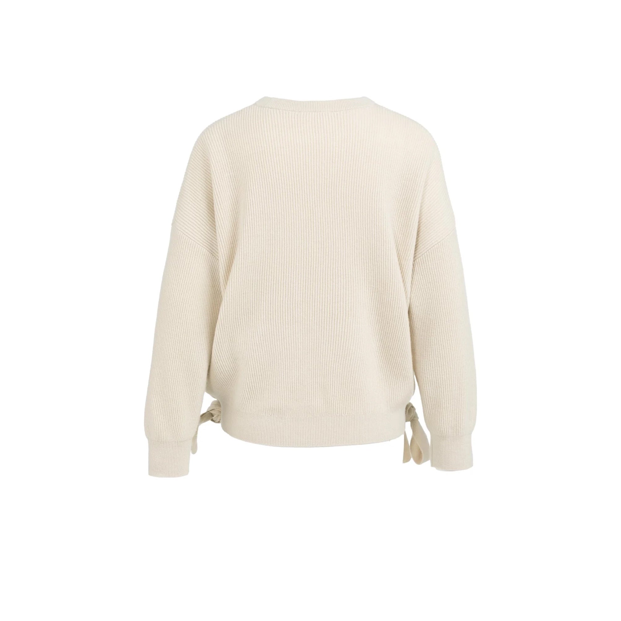 This knitted sweater features a round neckline, long sleeves and an oversized fit. The ribbed texture adds a refined look, while the tie details at the hem provide a playful twist. A comfortable and stylish piece perfect for a casual yet chic outfit.