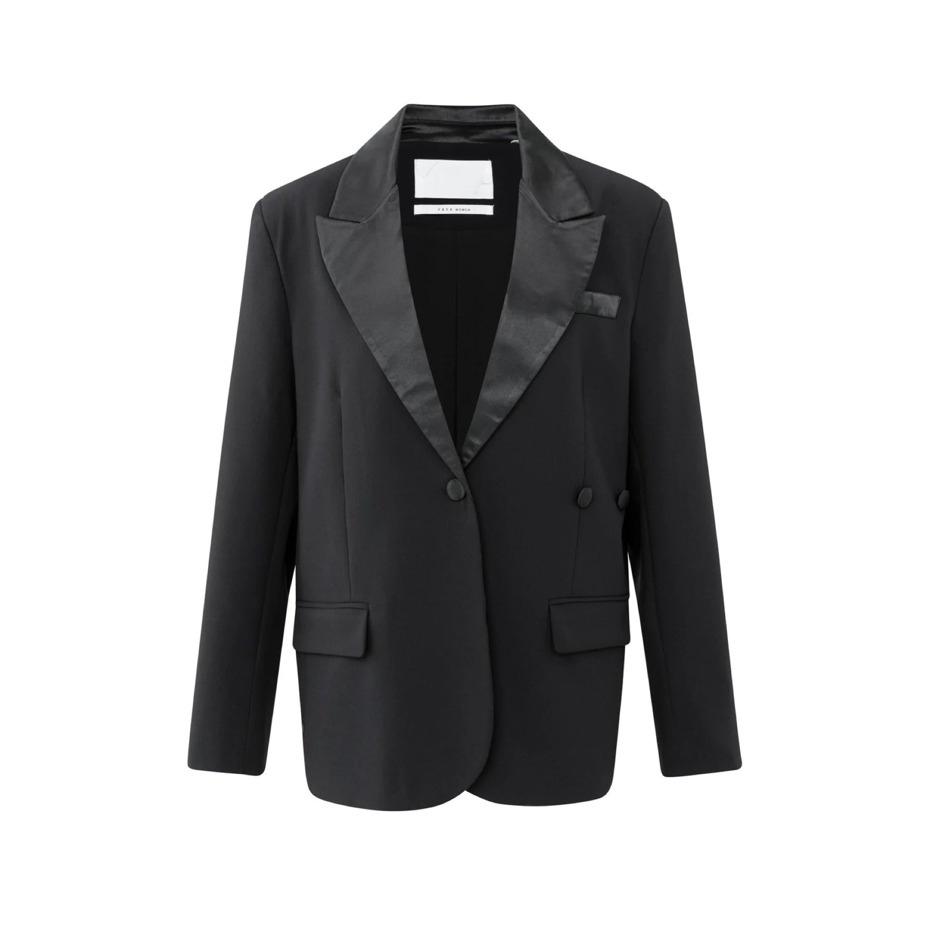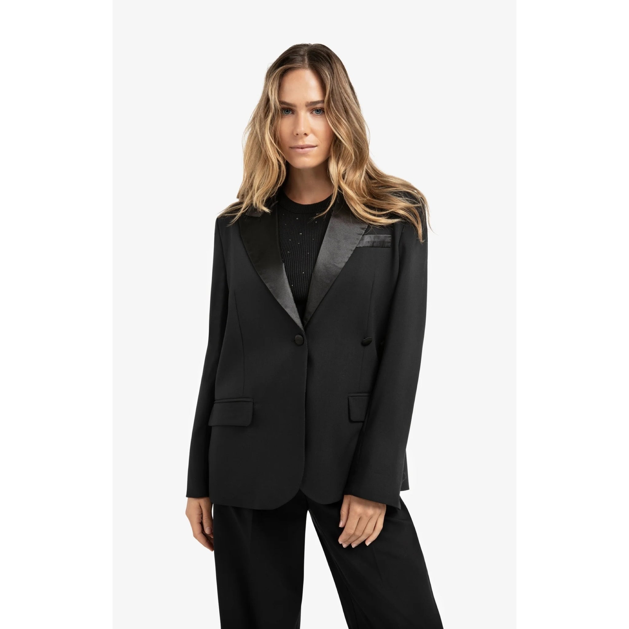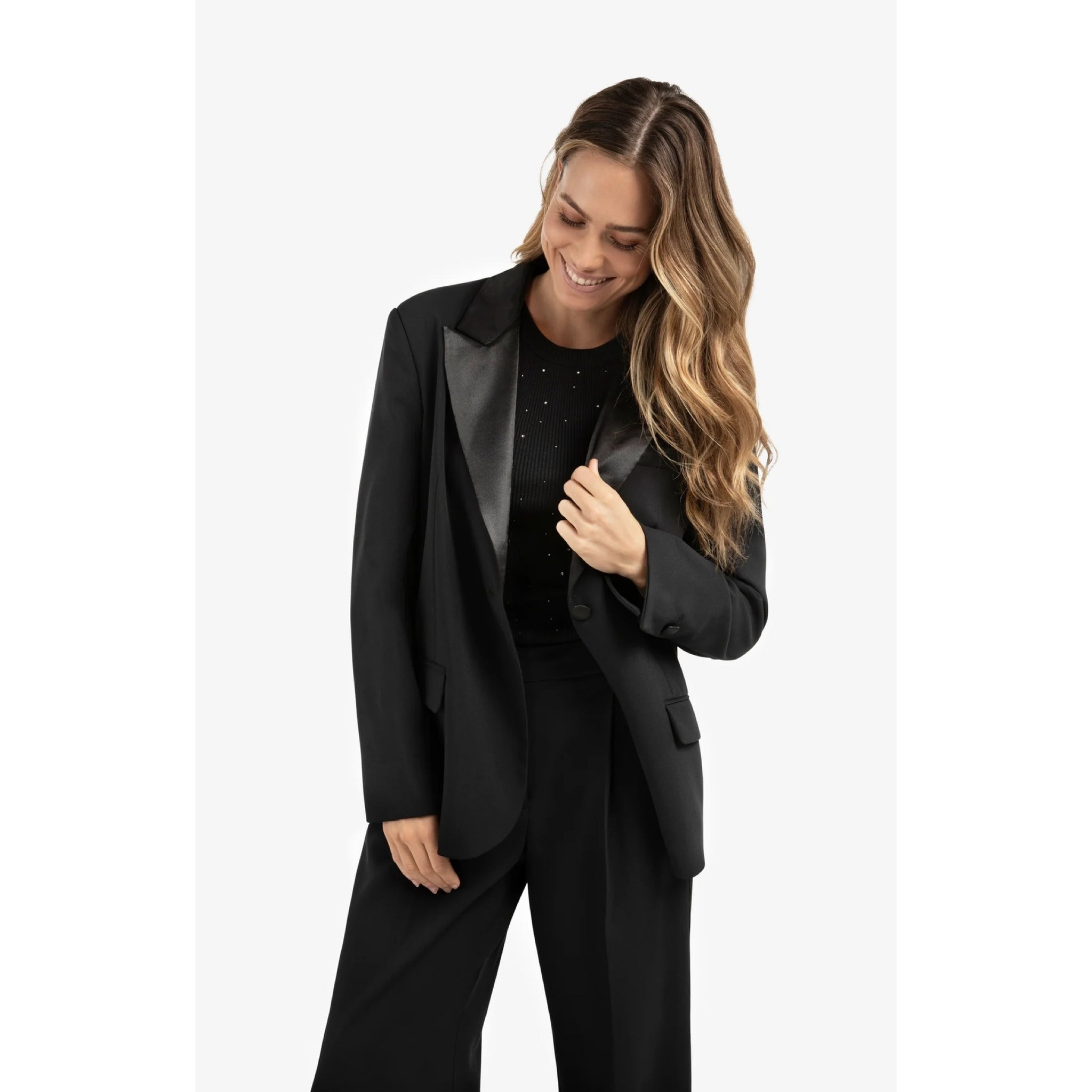 This elegant blazer is crafted from a soft woven fabric and features glossy satin lapels for a chic touch. Designed with a subtle waist accent, it closes with double fabric-covered buttons and includes flap pockets. The long sleeves are finished with button details. A refined piece that adds a modern twist to a feminine look.