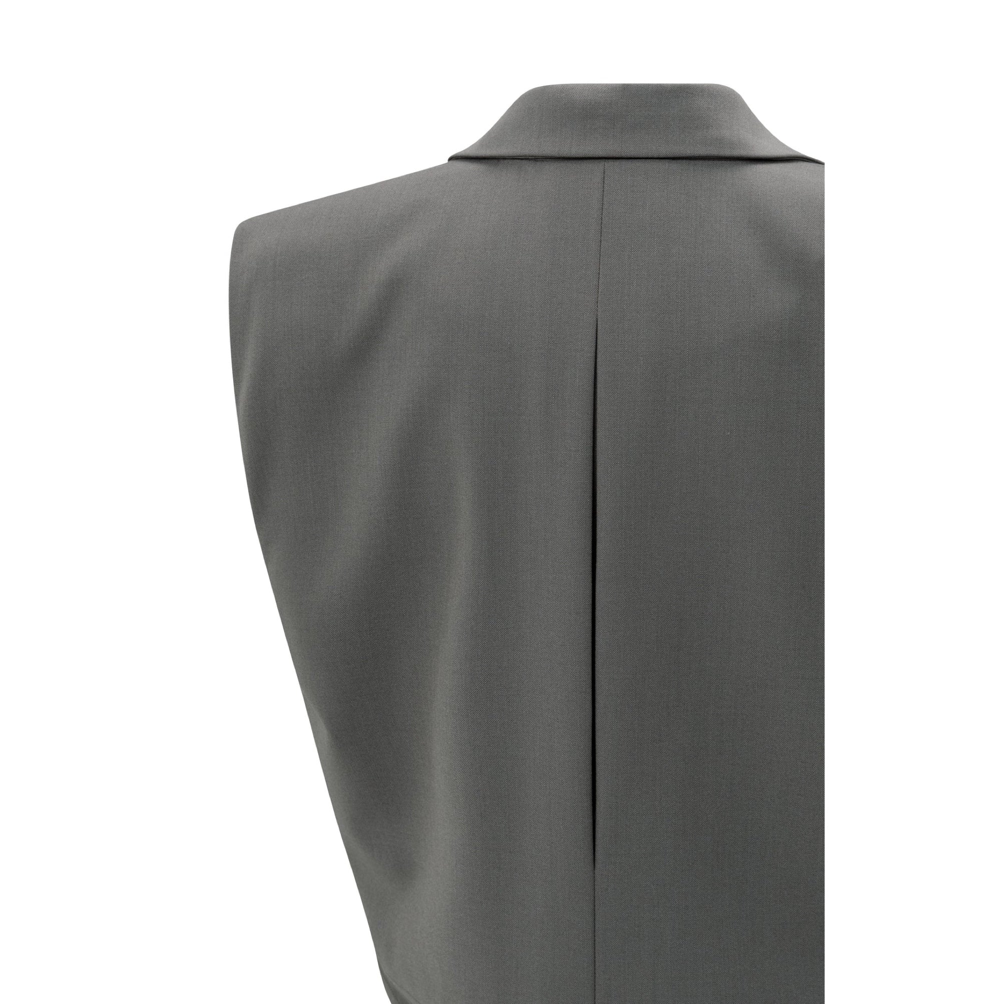 This contemporary sleeveless blazer is crafted from a soft woven fabric and features a cropped fit. The layered design and classic lapel collar add a refined touch. Finished with a fabric-covered button closure, a decorative chest pocket, and subtle frayed edges at the hem for a laid-back accent. Style it over a blouse or dress for an elegant, layered look.