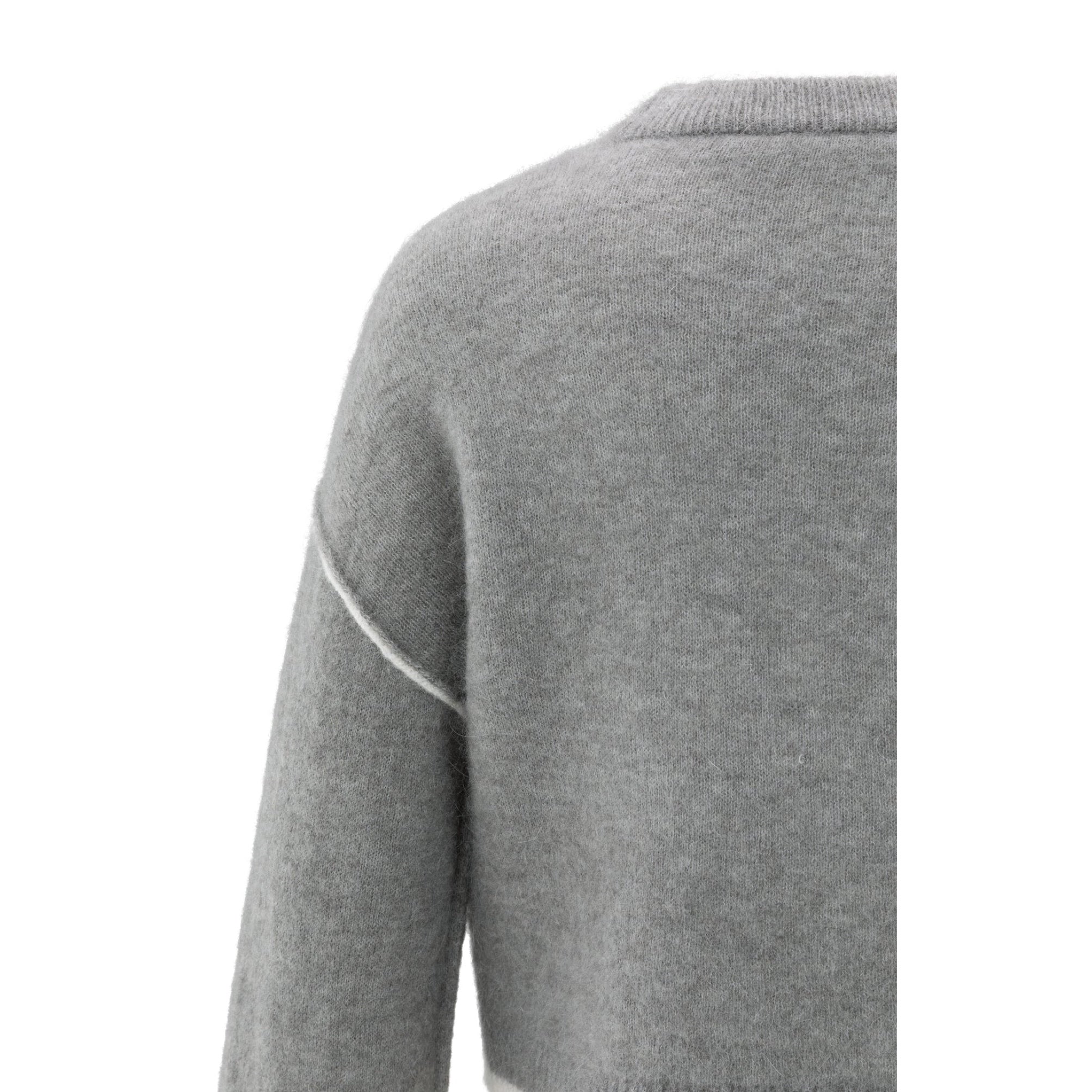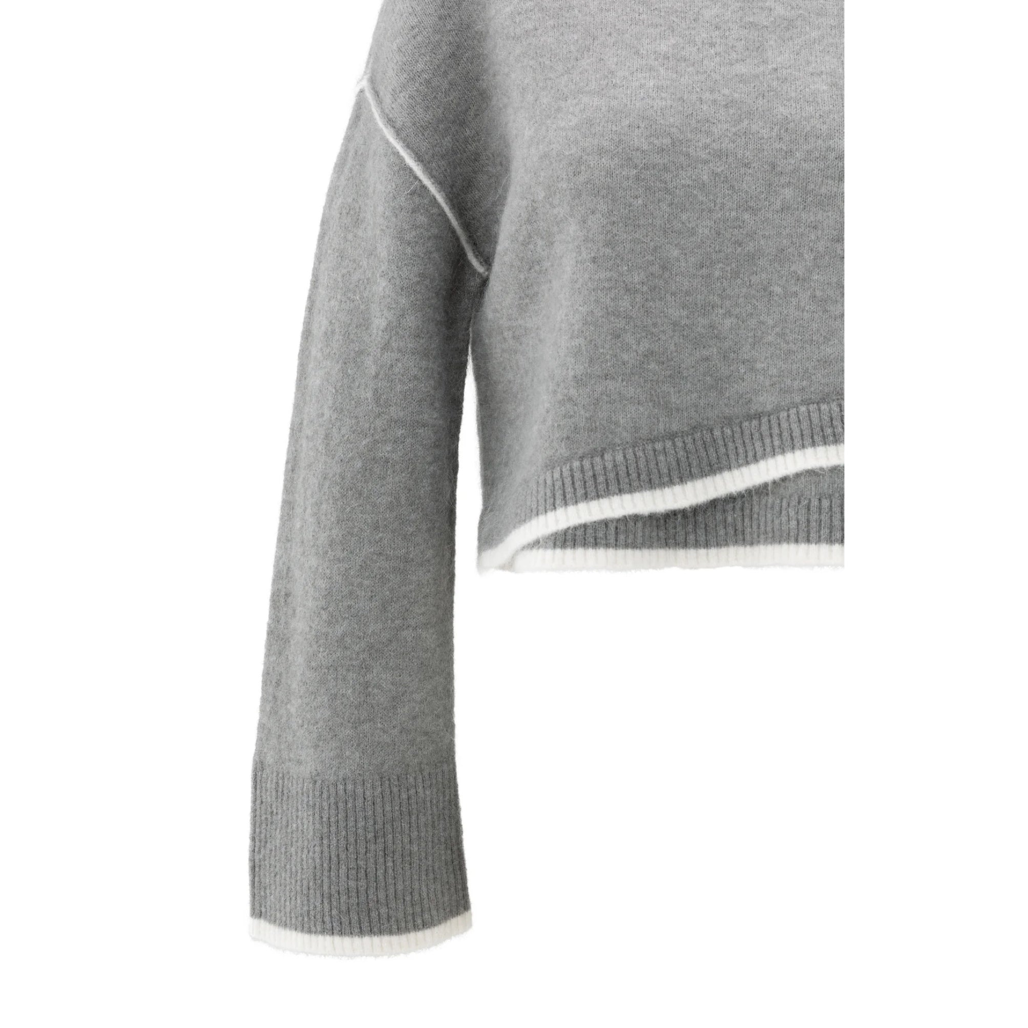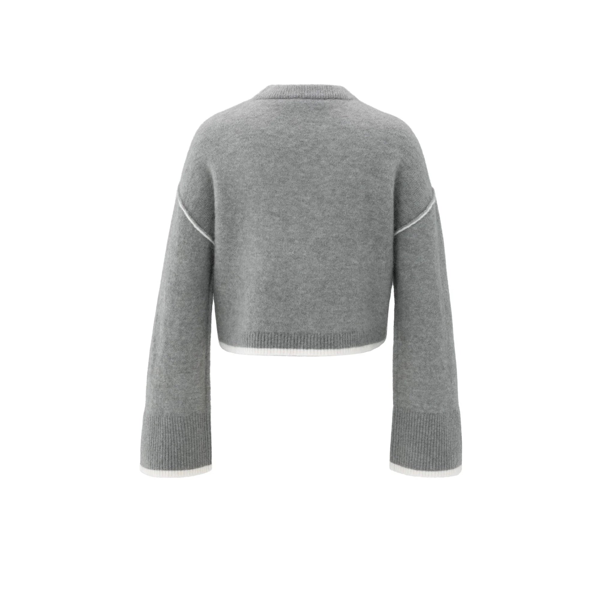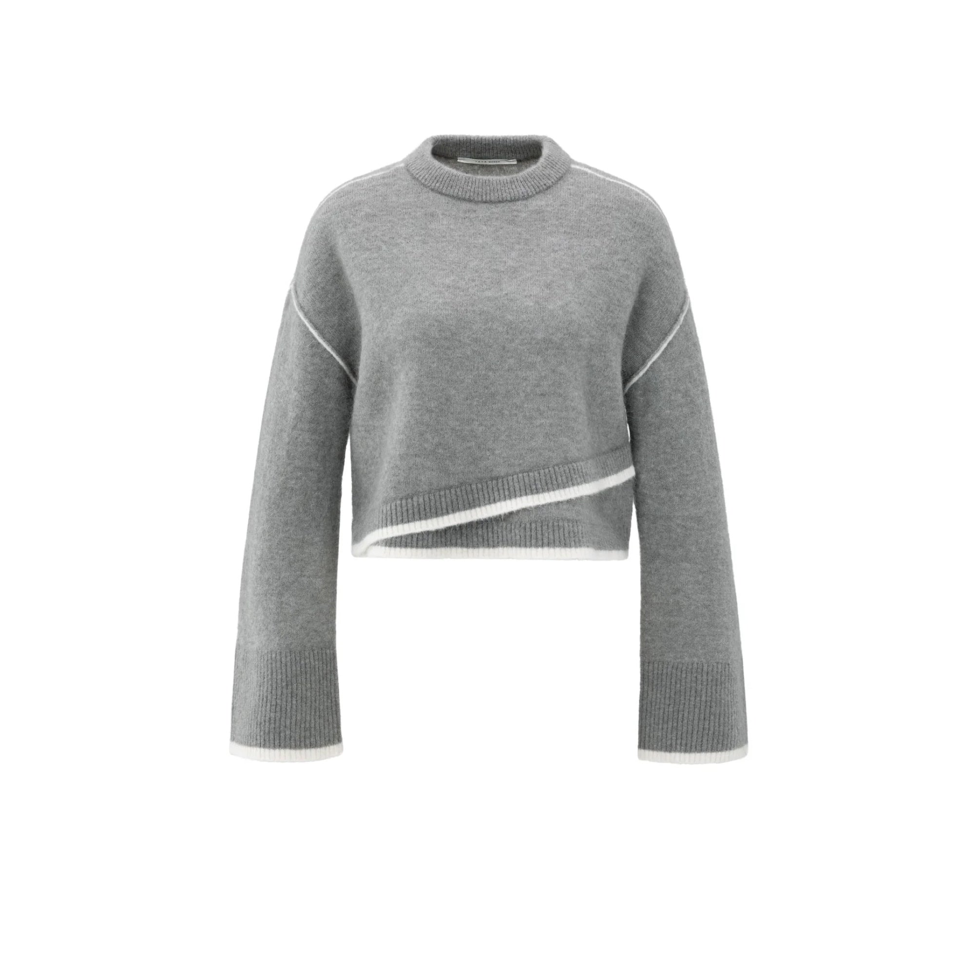 This soft knitted sweater features a short, straight fit and subtle contrasting lines along the hem, cuffs, and shoulder seams. Designed with a round neckline and dropped shoulders, it has a relaxed feel, while the diagonal finish adds a playful touch. A modern piece that blends comfort with style.