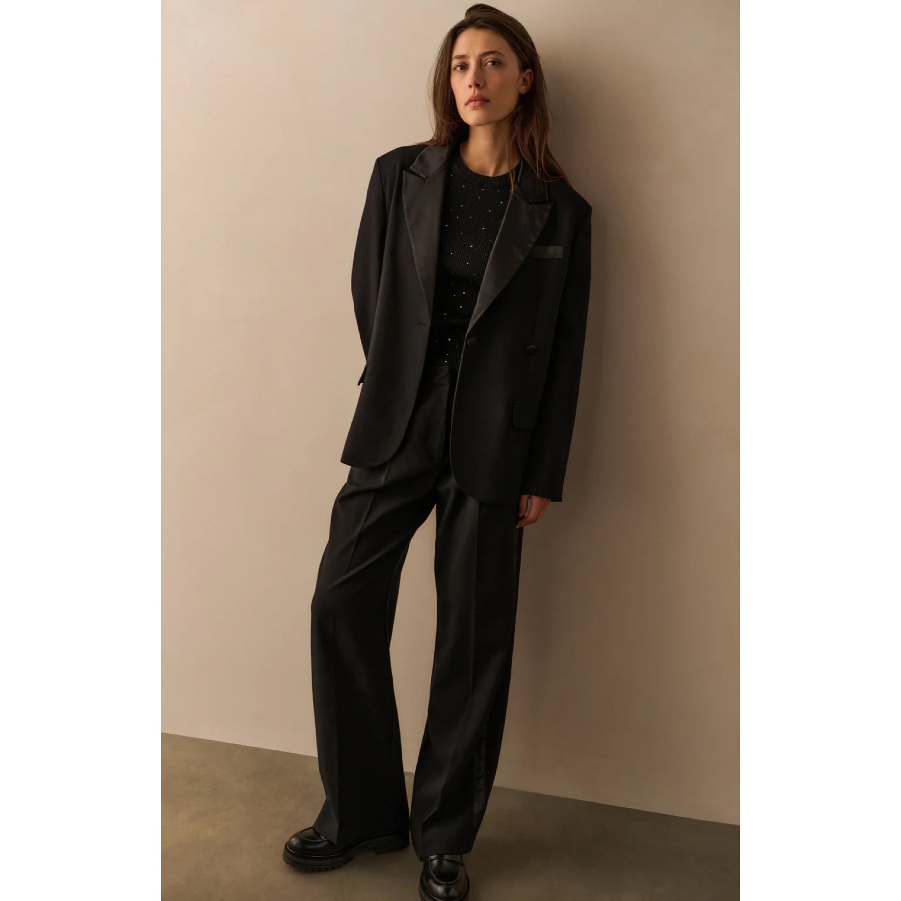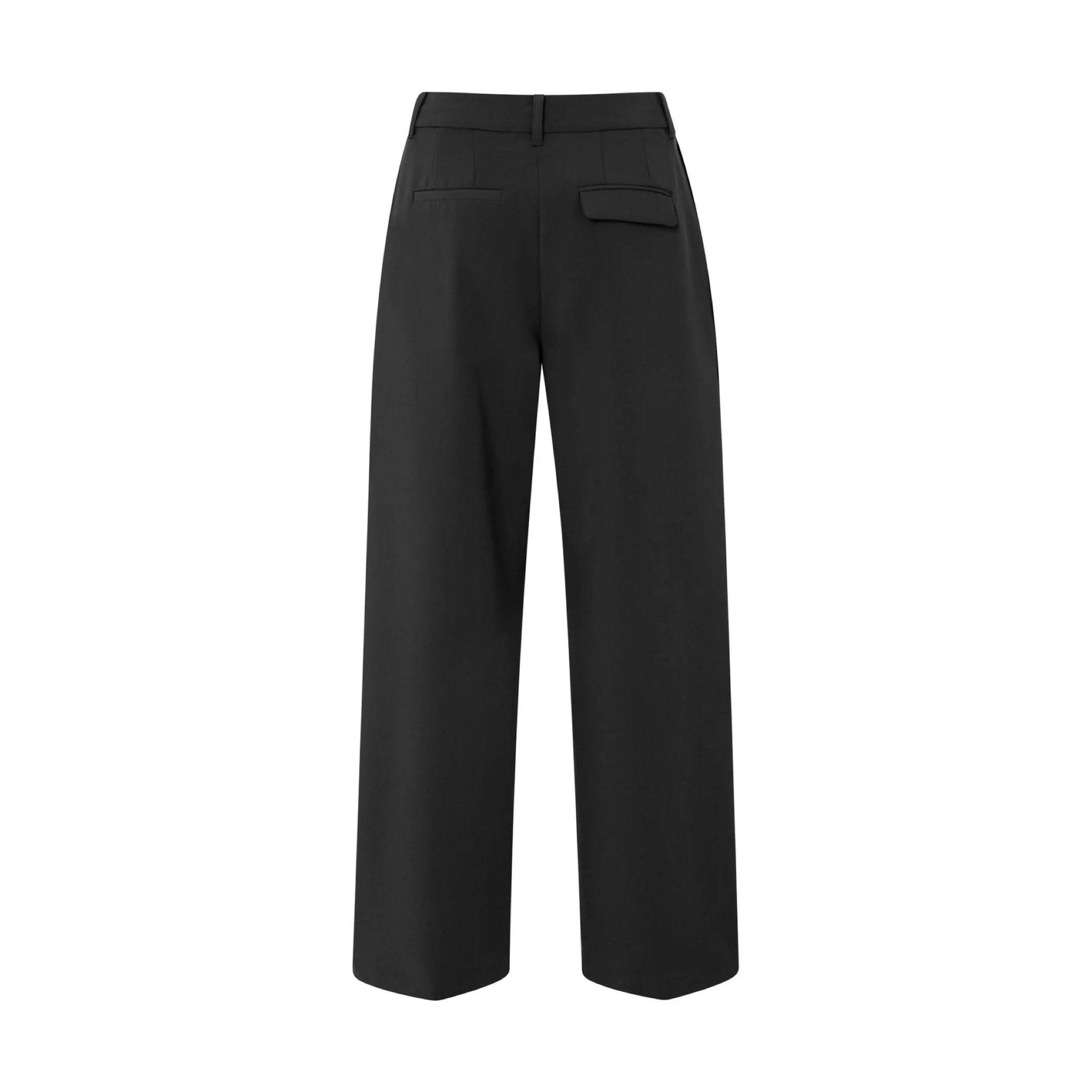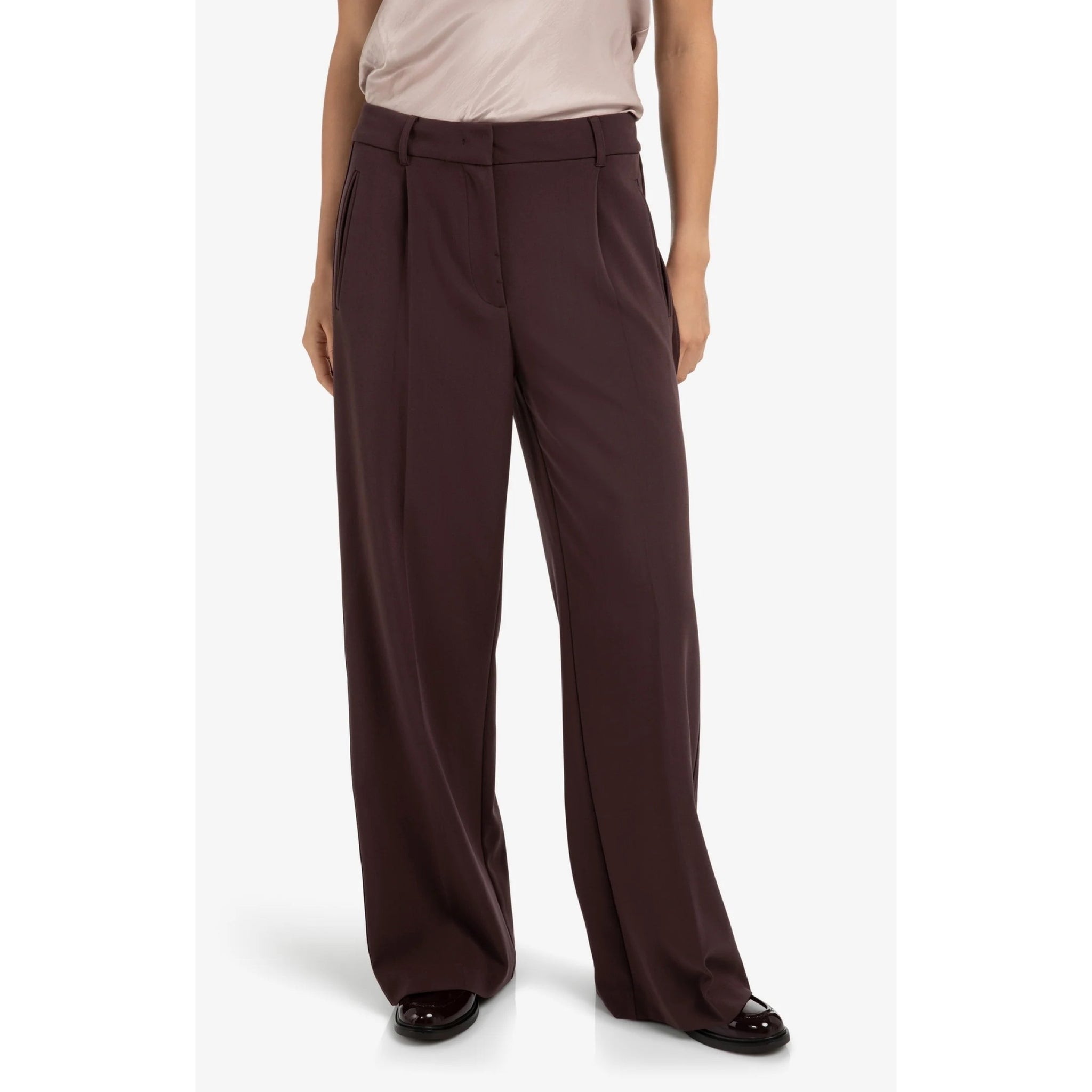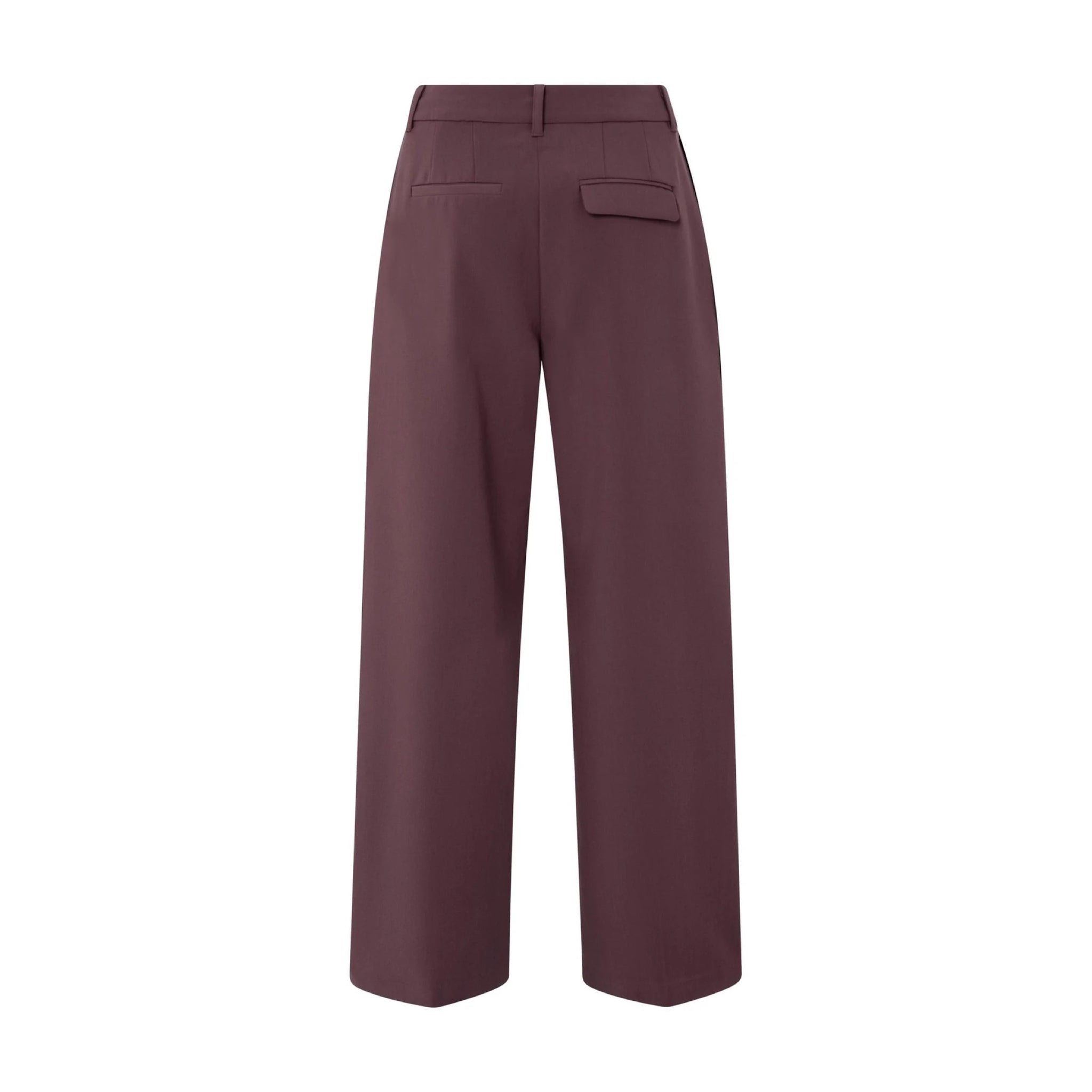 These elegant trousers are crafted from a soft woven fabric and feature a high-rise waist with front pleats. The wide legs create a flattering silhouette, while the satin side tape adds a chic and refined touch. Designed with side pockets, belt loops, and flap pockets at the back. Perfect for a stylish and feminine look.